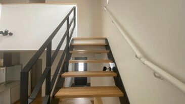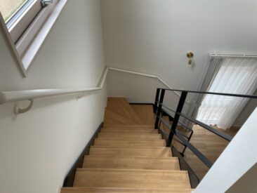 某住宅鉄骨階段+手摺を施工しました 木造住宅の中に黒焼付塗装のお洒落な鉄骨・・・インパクト抜群です! 新築の際はぜひご検討ください。 ~材料~ 手摺 FB-9*44 手摺子 FB-6*38 手摺支柱 FB-9*44 ササラ桁 PL-12